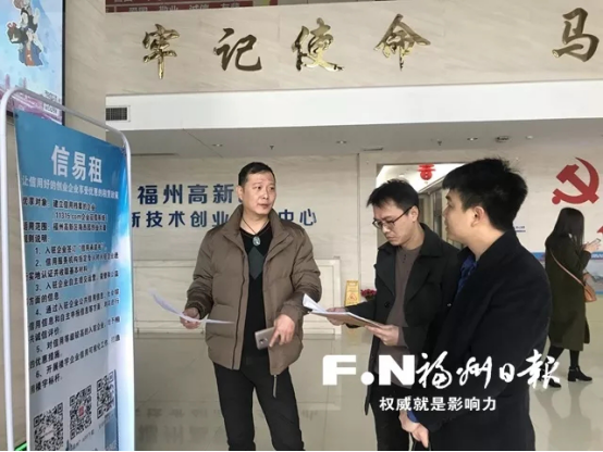 福州新聞網2019年2月23日,福州高新區在創業大廈試點“信易租”。福州高新區創業大廈一樓大廳,福建信盾信用管理有限公司的工作人員正和入駐企業宣傳“信易租。