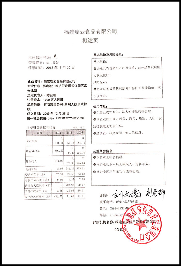 福建瑞云食品有限公司 XDPJ201803184