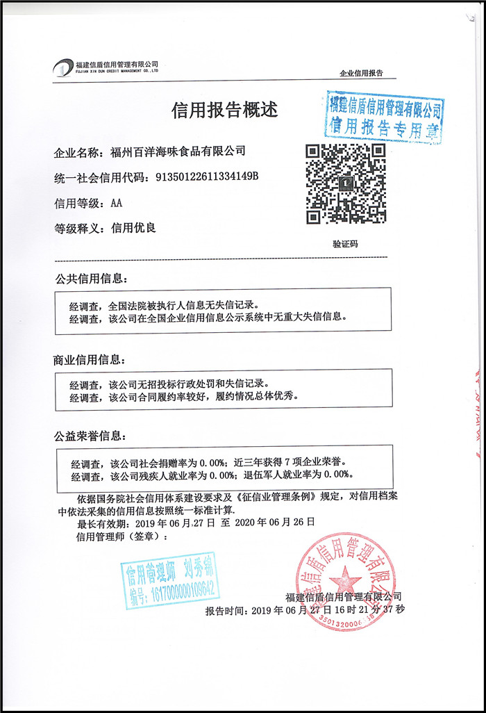 福州百洋海味食品有限公司2019